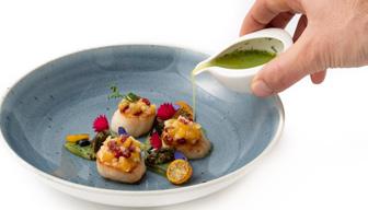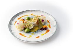 Always colorful, his dishes charm the eye before delighting the taste buds. Thorough cooking and balanced seasonings are the signs of his meticulous work. Although the seasons are always respected, his “signature” dishes, called “essentials”, never leave the menu. That is the case for his divine “cuttlefish cannelloni with cuttlefish ink in crustacean jus” or “Alpilles’ saddle of lamb cooked in Vallauris clay”!