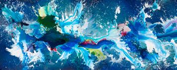 In addition, energetic streams of color, powerful splashes, and apparently spontaneous, airy gestures form an exciting symbiosis in a dialogue between spontaneity, experiment and artistic calculation. They unite to form poetically pulsating color worlds that sweep the viewer away into a cosmos of colors and emotions.