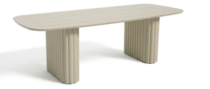 Table à manger d'extérieur réalisée avec une structure en aluminium et un plateau en porcelaine, qui offre une surface résistante, moderne et facile à entretenir. Son design droit et stylisé offre un look épuré et contemporain, idéal pour les terrasses et les espaces repas extérieurs.