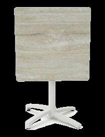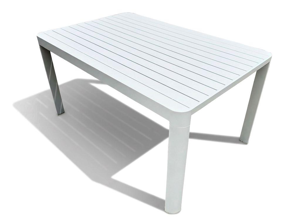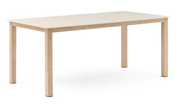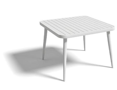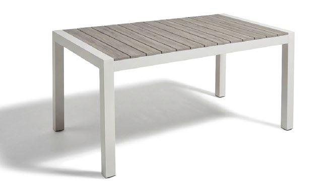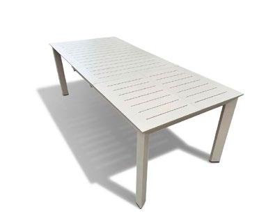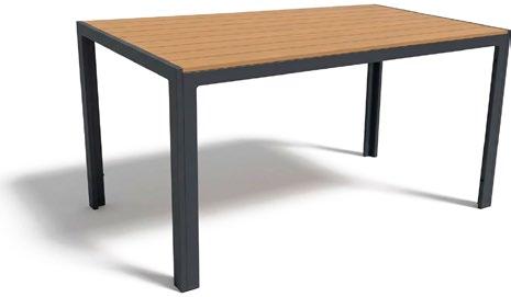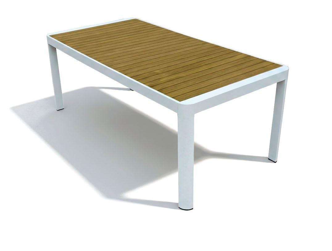 Mesa de jantar externa confeccionada com estrutura em alumínio e painel em porcelanato, que oferece uma superfície resistente, moderna e de fácil manutenção. Seu design reto e estilizado proporciona um visual clean e contemporâneo, ideal para terraços e áreas de jantar ao ar livre.