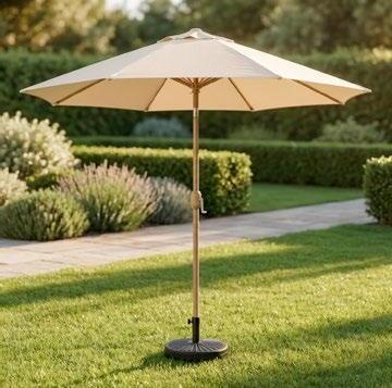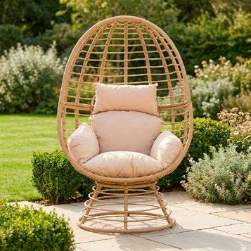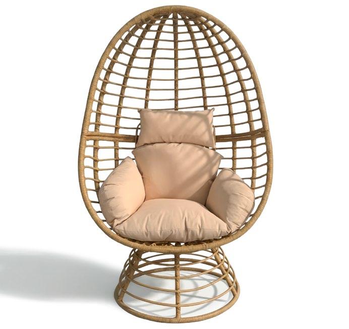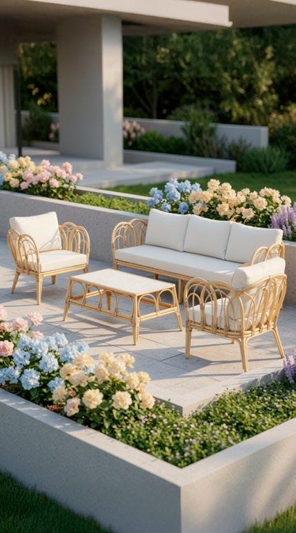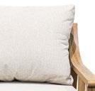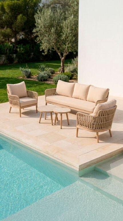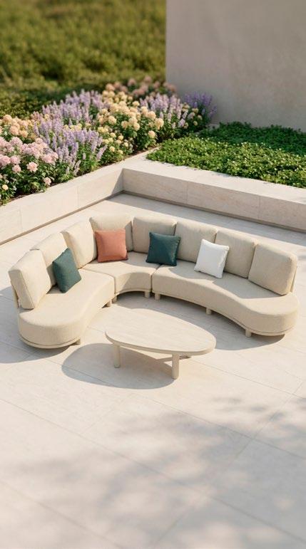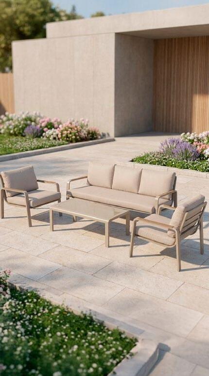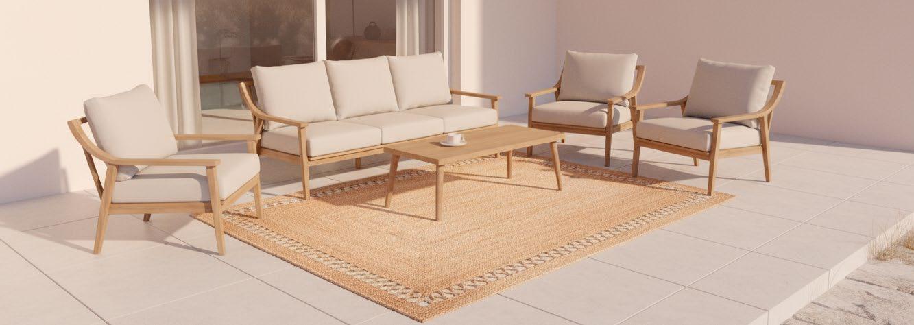 Conjunto outdoor de quatro peças que combina linhas curvas contemporâneas com materiais resistentes. Estrutura em alumínio com acabamento que imita madeira para um visual aconchegante sem a manutenção da madeira natural. Almofadas grandes em tecido de poliéster bege, macias ao toque e fáceis de limpar, ideais para terraços, jardins ou varandas.