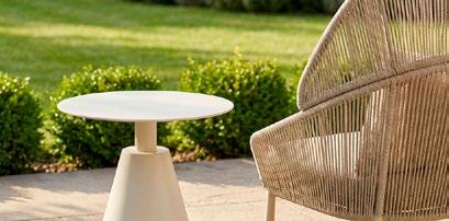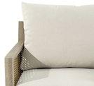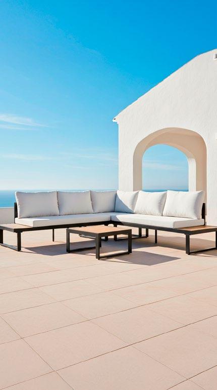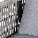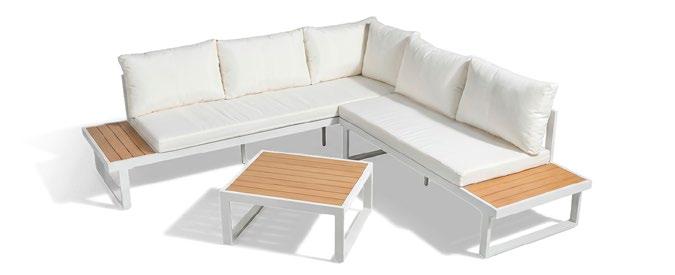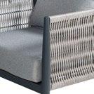 Conjunto outdoor composto por sofás modulares confeccionados com estrutura de alumínio soldado e pintura a pó para garantir resistência e durabilidade. Os assentos incorporam uma trança tipo corda que proporciona uma estética moderna e textura artesanal. Todos os módulos incluem almofadas de 23 cm de espessura no assento e no encosto, oferecendo conforto superior. A mesa lateral possui superfície HPL, ideal para ambientes externos devido à sua alta resistência ao desgaste e às intempéries.