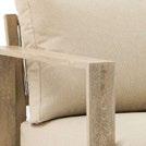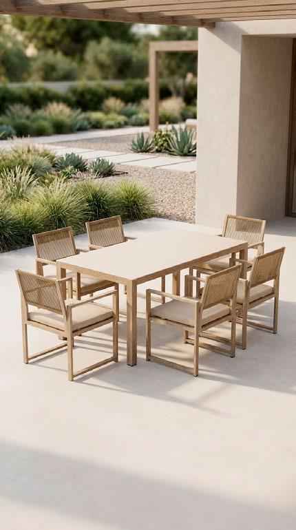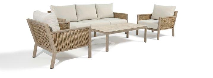 Conjunto outdoor composto por sofás de um e três lugares com estrutura de alumínio soldado e acabamento granulado escovado à mão, que proporciona uma estética aconchegante semelhante à madeira. O rattan sintético oferece resistência e design natural, enquanto almofadas e travesseiros de encosto de 10cm garantem conforto. A mesa de centro combina a mesma estrutura de alumínio com tampo em pedra sinterizada, resistente e de fácil manutenção.