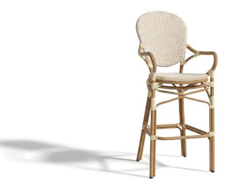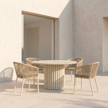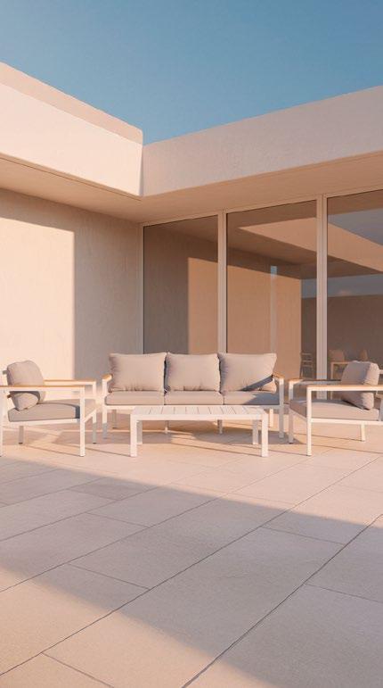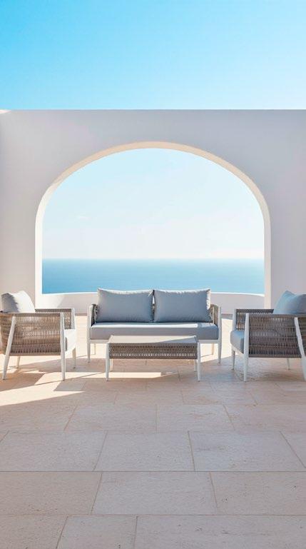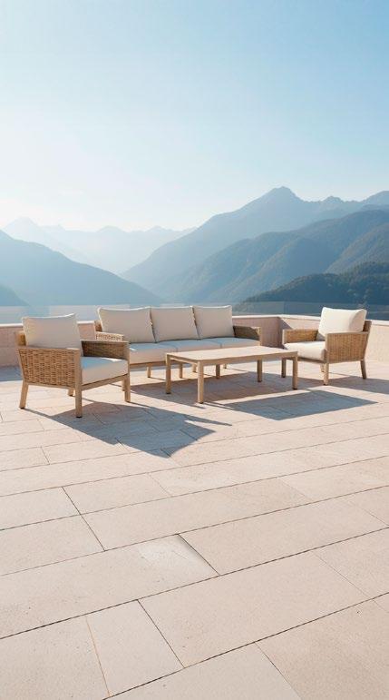 Material: Alumínio com acabamento granulado escovado à mão, rattan sintético, almofadas e encostos, tábua de pedra sinterizada
