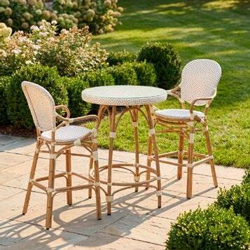 Conjunto contemporâneo de sala de estar exterior de quatro peças que combina conforto e estilo para terraços e jardins. Laterais com cordões decorativos e braços com detalhes em alumínio simulando madeira para um contraste aconchegante.