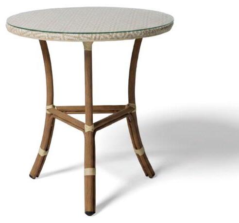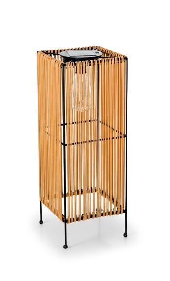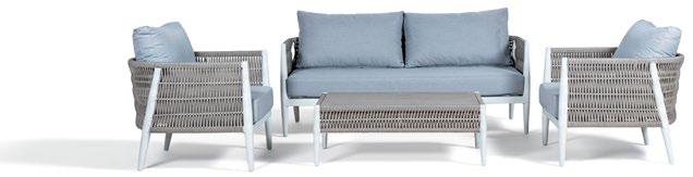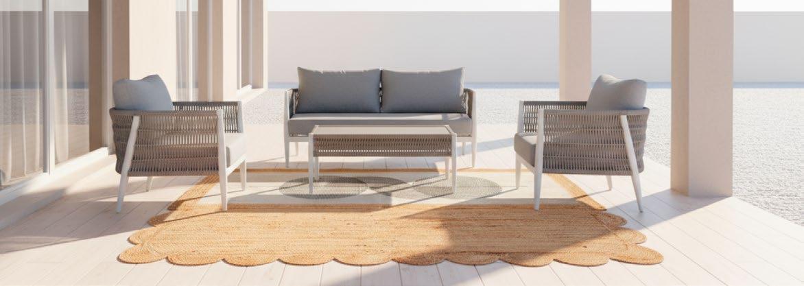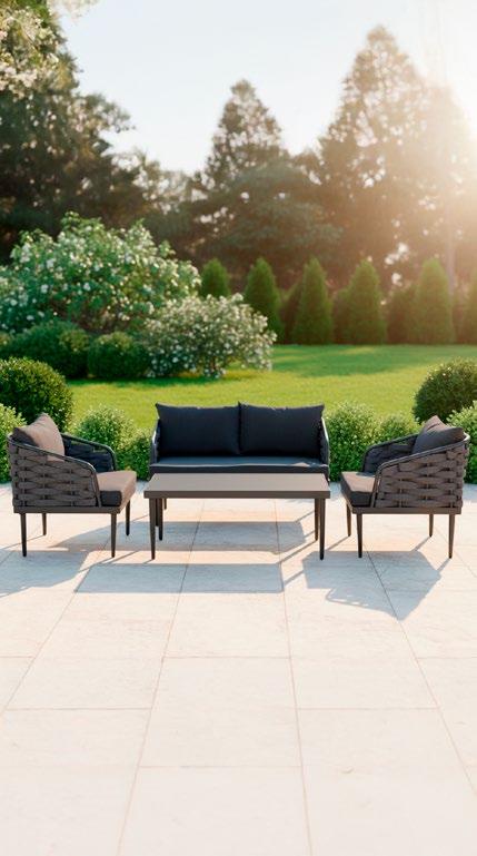 Conjunto exterior de quatro peças com moldura alumínio revestido a pó preto. Os lados do conjunto e a mesa são forradas com vime formou uma textura de corda. As almofadas são algodão bege e a mesa é forrada em cerâmica.