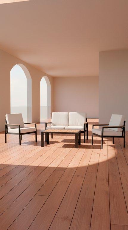 Conjunto de exterior composto por um sofá de três lugares, duas poltronas individuais e uma mesa lateral. A estrutura de todas as peças é em alumínio com pintura eletrostática a pó, o que garante resistência e fácil manutenção. A mesa incorpora uma superfície de polywood com um aspecto quente e durável, enquanto as almofadas de poliéster de 9 cm proporcionam conforto e um acabamento confortável para uso ao ar livre.