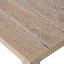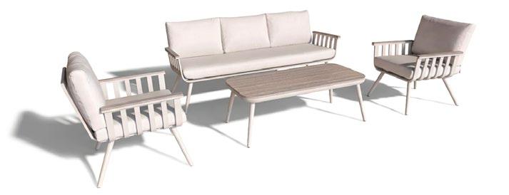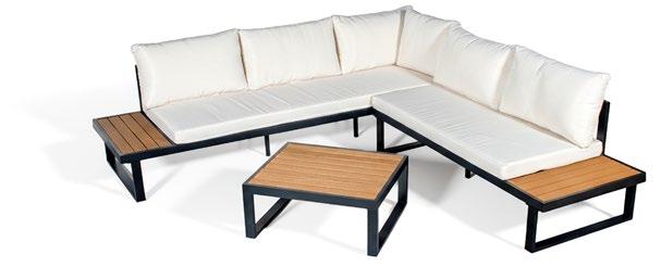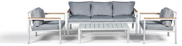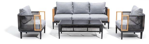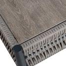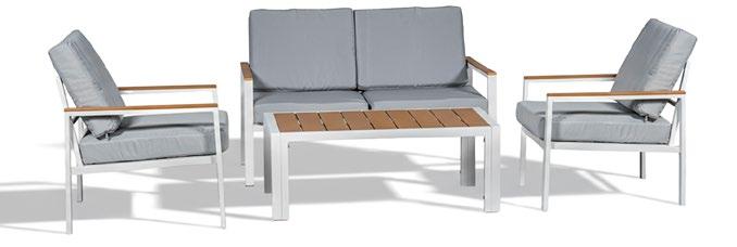 Conjunto de exterior de quatro peças com moldura alumínio imitando madeira. O apoio do os assentos são cobertos com corda. As almofadas são algodão cinza. A mesa de alumínio com ripas imita a madeira através de uma transferência de cores.