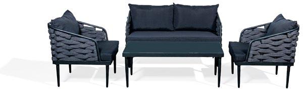 Conjunto de exterior de quatro peças com moldura alumínio revestido a pó preto. Os lados do conjunto e a mesa são forradas com vime formou uma textura de corda. As almofadas são algodão cinza e a mesa é forrada de cerâmica.