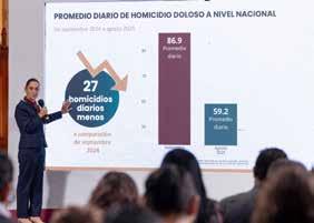 El promedio diario de homicidio doloso nivel nacional pasó de 86.9 víctimas diarias en septiembre de 2024 a 59.2 en agosto de 2025, lo que se traduce en una reducción del 32 por ciento