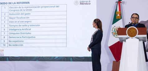 En cumplimiento al compromiso que asumió con el pueblo de México y a sus principios, la Presidenta Claudia Sheinbaum Pardo presentó la iniciativa de reforma constitucional en materia electoral, que será enviada el lunes 2 de marzo al Congreso de la Unión, la cual se compone de 10 puntos: 1. Eliminación de las listas de los partidos políticos para la representación proporcional del Congreso de la Unión; 2. Reducción del 25 por ciento en el costo de las elecciones; 3. Mayor fiscalización; 4. Voto en el extranjero; 5. Disminución de los tiempos de radio y televisión de 48 a 35 minutos diarios; 6. Regulación del uso de Inteligencia Artificial y prohibición de bots; 7. Cómputos Distritales; 8. Democracia Participativa; 9. No nepotismo; y 10. No reelección.