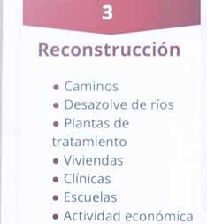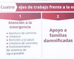 En apoyo al campo y la ganadería se entregará un apoyo de entre 50 a 100 mil pesos, dependiendo el número de hectáreas por parcela. En materia educativa, se entregarán 350 pesos para la recuperación de útiles escolares en beneficio de 190 mil niñas y niños, además con La Escuela es Nuestra se intervendrán 750 escuelas, a través de una inversión de 200 mil pesos adicionales al seguro que se tiene para cubrir el daño a la infraestructura. En este mismo esquema, con La Clínica es Nuestra, 282 unidades de salud serán reconstruidas, lo que sig -