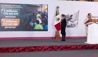 La secretaria de Gobernación, Rosa Icela Rodríguez Velázquez, destacó que en el marco del eje de Atención a las Causas, en total se han brindado más de 5 millones de servicios en beneficio de más de 3 millones de personas. Se han realizado 300 mil visitas casa por casa en municipios prioritarios, se recuperaron 373 espacios públicos, se realizaron 7 mil 310 Jornadas por la Paz, a través de las 298 Mesas de Paz Estatales y Regionales, más de un millón de personas participaron en actividades como tequios o reforestaciones; 856 mil 464 jóvenes se sumaron a actividades de la campaña por la Paz y contra las Adicciones; se ha realizado más de medio billón de acciones médicas, se conformaron 353 Comités de Paz, 456 Ferias de Paz y casi 300 mil jóvenes participaron en talleres, 67 mil asistieron a Ferias de Empleo y Emprendimiento, además 247 mil se inscribieron en el Programa Jóvenes Construyendo el Futuro.