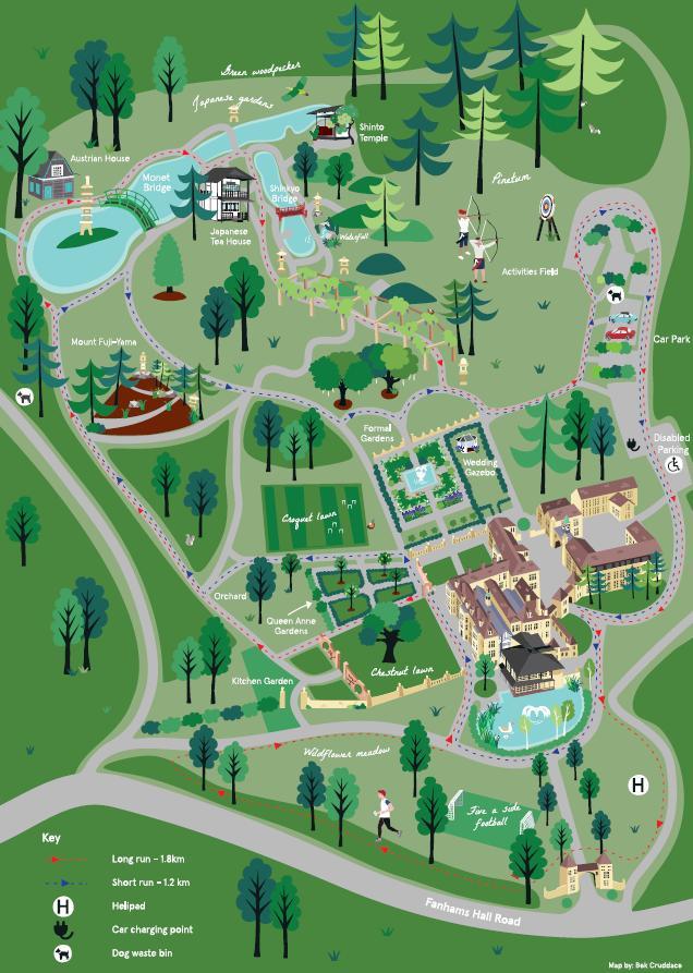 The Japanese gardens were designed by a Mr Inaka and laid out by Professor Suzuki. Japanese gardeners came over from Japan each summer in pre-war days, to carry out work on the ornamental lakes and the hill, little Fuji-yama, and to plant the trees and shrubs. A Japanese teahouse is situated near the Fox Lake. The Japanese garden; the Austrian house and the lake, the wisteria walk, the lime walk around the croquet lawn, the Queen Anne garden with the red brick paths, the lily pond, formal gardens and herbaceous borders are all great points of interest in the grounds. The red brick paths of the Queen Anne garden when examined more closely will reveal many more recent designs. The grounds abound with a variety of beautiful trees, the more rare varieties including Japanese maples and a group of three catalpa trees. The large mound known as Fuji-yama Mound was built with the earth excavated from the two lakes.