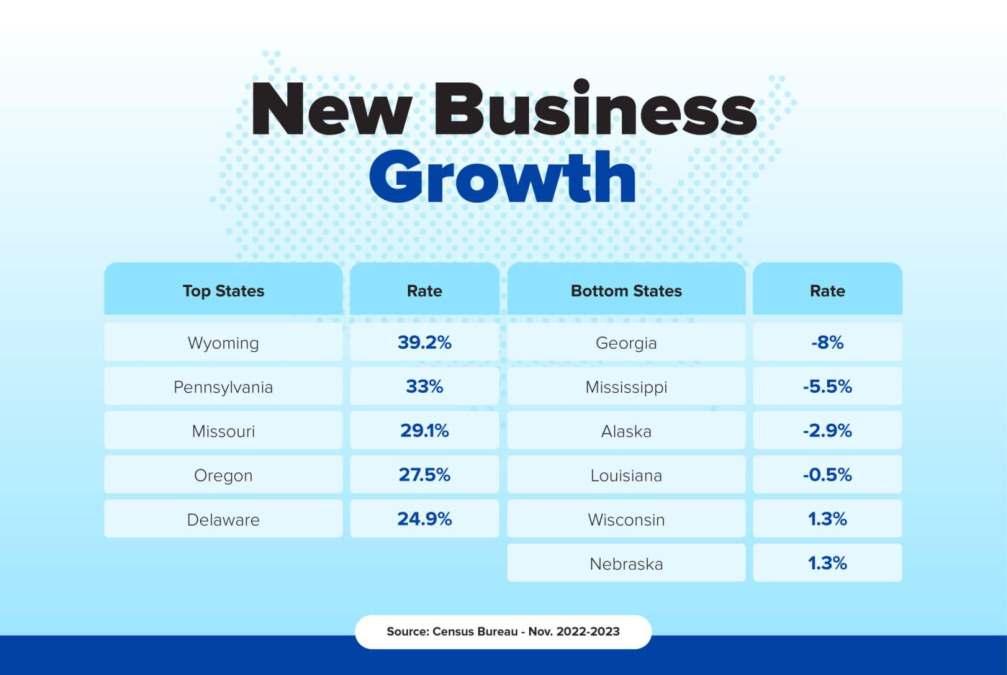 Ÿ New Business Growth: Wyoming and Pennsylvania lead, while Georgia, Mississippi, and Louisiana lag behind.