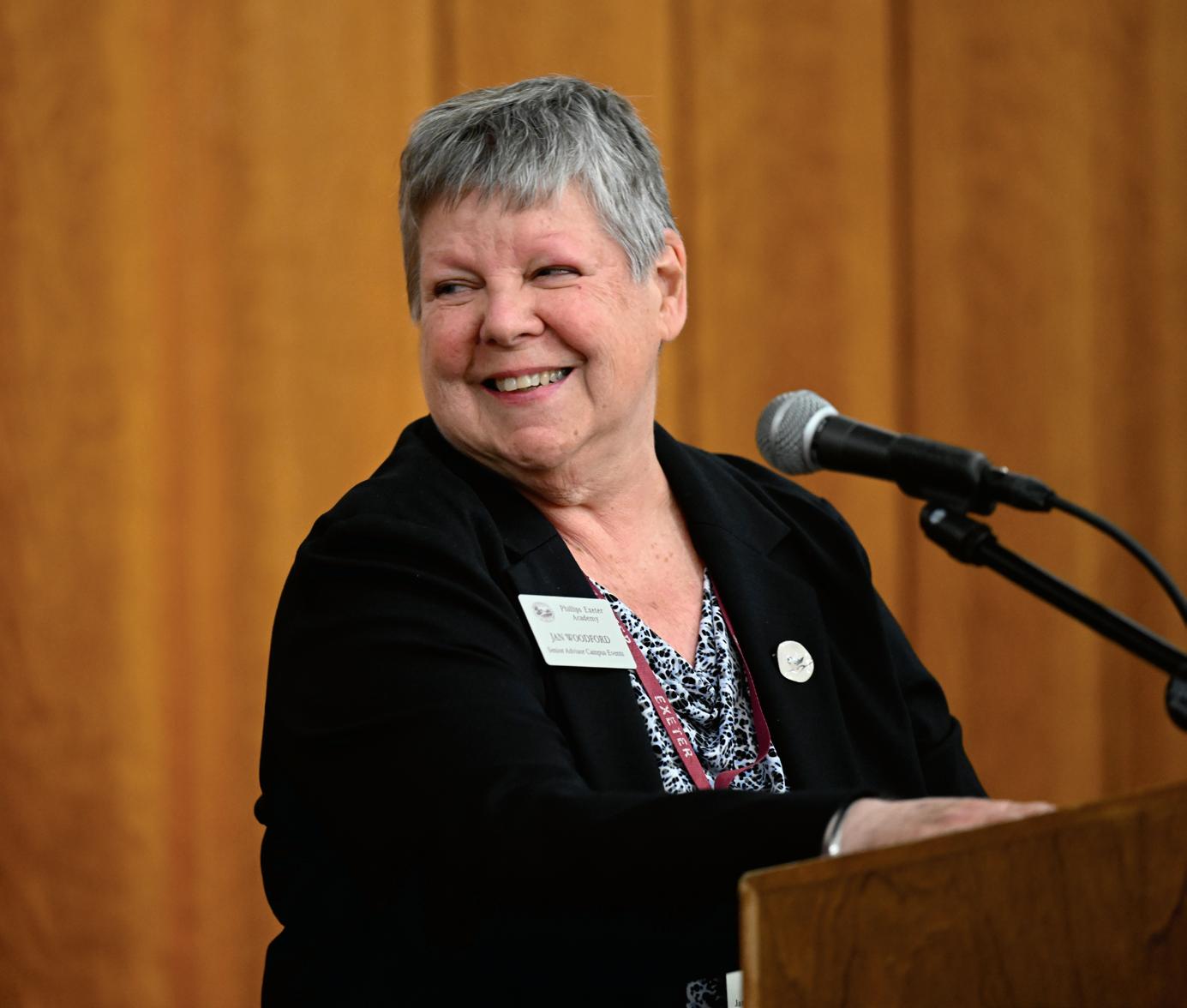 of those classes — the most of any community member — Woodford worked closely with alumni volunteers and departments across campus to ensure events were flawlessly executed all while keeping calm under pressure. Nancy Smith Douglas ’79 likens Woodford to “a beautiful swan gliding effortlessly over the surface of the water while paddling madly beneath.”