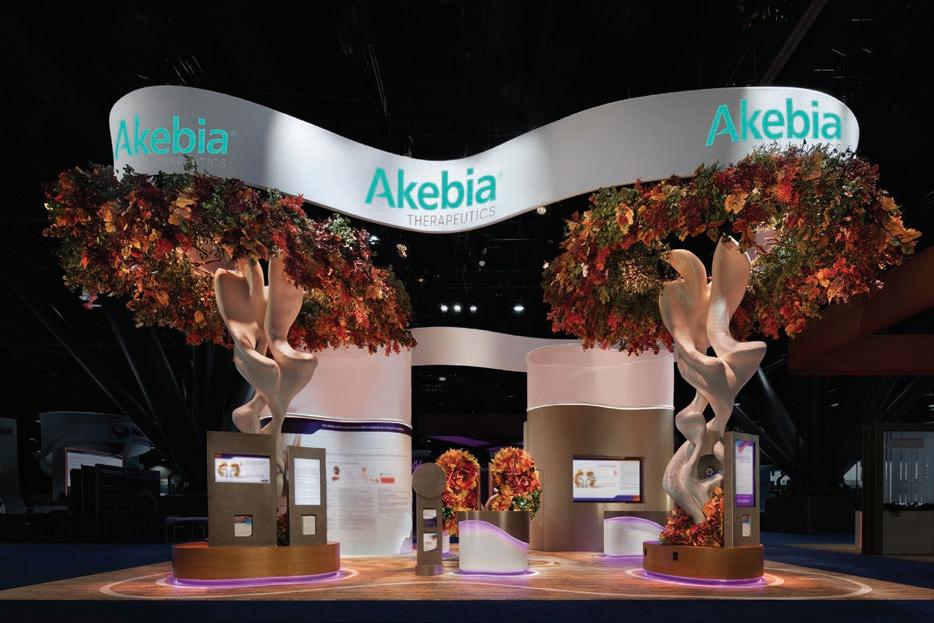 Akebia Therapeutics launched a new drug developed from Nobel Prize-winning science, targeting complications of kidney disease. Working with their agency, Access designers created an exhibit that featured tactile, organic elements. Instead of digital-screen overload, the result was a nature-inspired environment with curved, tree-like columns that symbolized both molecular science and natural growth. The trees had multi-colored leaves inspired by molecular imagery, connecting science and art that engaged attendees.