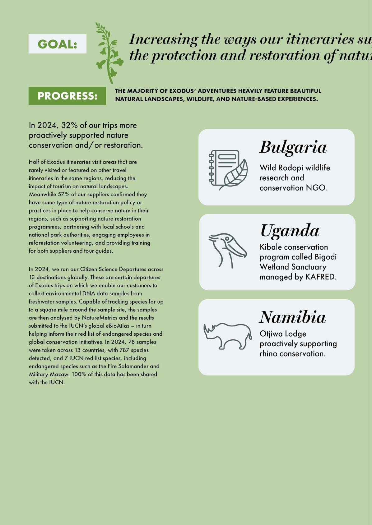 In 2025, we are continuing our Citizen Science Departures across 10 Exodus destinations, including our first time taking eDNA samples in Chile, and we are improving pre-departure information for these particular trips. Our aim is to derive above-average sustainability-related customer feedback scores on these departures.