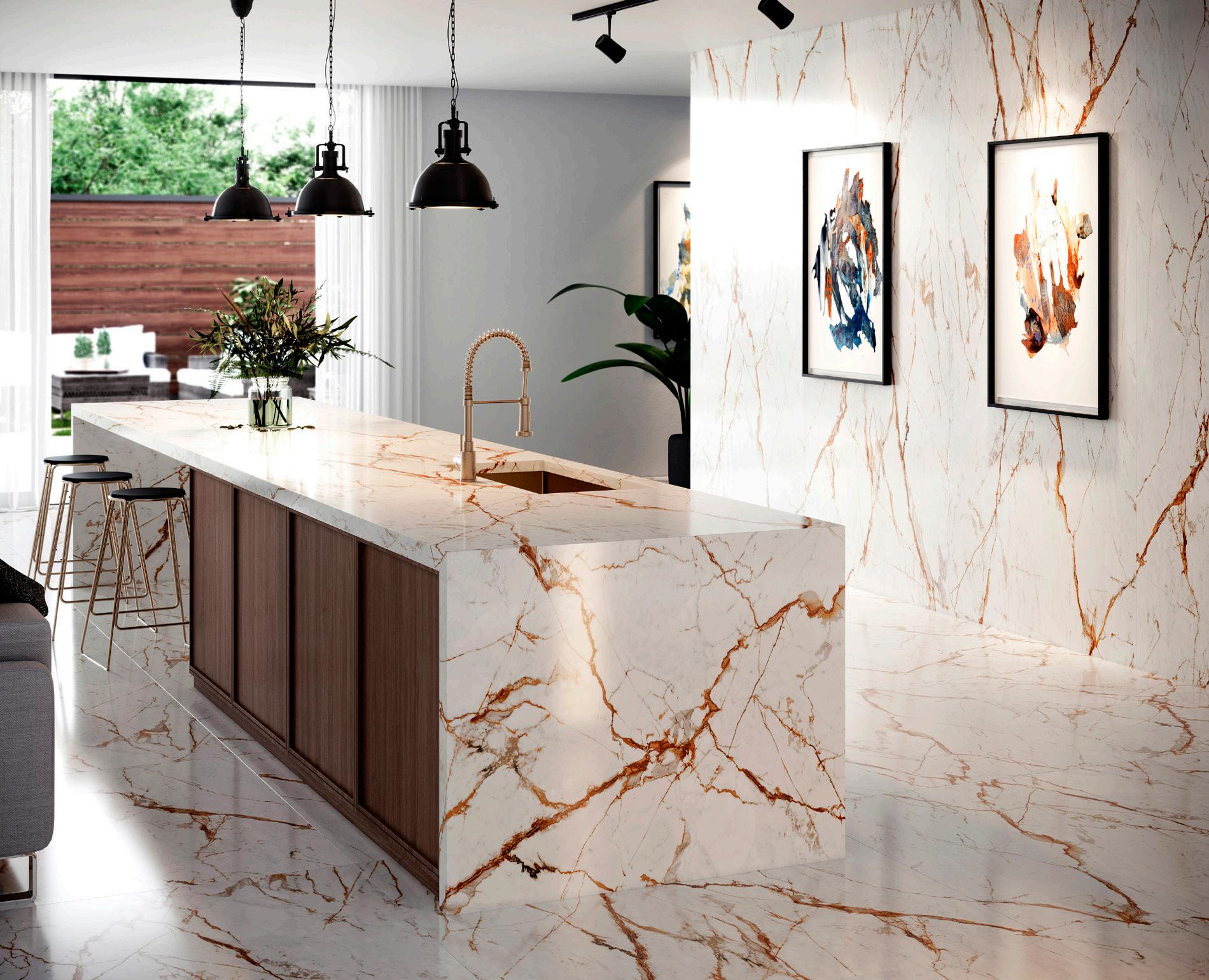 Los acabados marmoleados con colores estarán presentes no sólo en baños y cocinas, sino que saldrán hacia la sala y el comedor para brindar textura y variedad a los espacios. Mientras el año anterior predominaron los verdes y rosas, este destacarán más los contrastes de fondos neutros y vetas metálicas.
