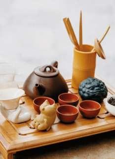 En el estilo chino gongfucha, la creencia es que el té tiene una mascota. Como los alebrijes en México, son diferentes figu ras de animales hechas de arcilla y re presentan el alma y la personalidad de quien prepara el té. La creencia es que cuando vas a comprar uno, la mascota te elige. La mascota se pone en la cha rola del ritual y se “despierta” cuando to dos están reunidos y el anfitrión la baña con el chorro de la primera infusión. Se cree que cada vez que se les comparte té, su alma se llena y adquieren un valor sentimental para su dueño.