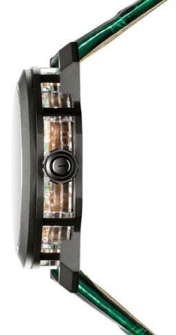 creativo de Bvlgari. El verde de sus índices es malaquita que contrasta con sus manecillas caladas en rojo. Pero el espectáculo estético se extiende también a la parte trasera del reloj: cada una de las piezas está decorada con el Calendario Azteca, sumamente detallado y preciso gracias al terminado metalizado. Para sumar al deleite visual y técnico, la caja central se ha terminado en cristal de zafiro desde donde se pueden apreciar las columnas de titanio tratadas con DLC que soportan la estructura de la pieza; de esa manera se observa todo el calibre sin interrupciones. Finalmente, la correa es de piel de lagarto en verde con pespuntes blancos. Sin duda, una obra de arte digna de coleccionar.