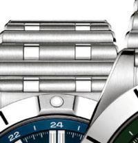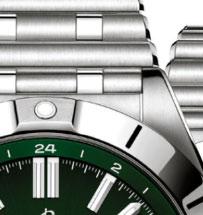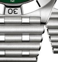 van desde el negro hasta el antracita, pasando por el blanco y el ya obligado verde. En todas ellas, el tradicional cronógrafo se ha reemplazado con un útil doble huso horario que les permite ofrecernos una carátula simplificada, sin que esto signifique que haya perdido su magnético atractivo. El segundo huso horario se indica con una manecilla en color rojo, lo que facilita la lectura de las horas y los minutos, además de que cuenta con un fechador localizado a las 6 horas. La caja de 40 mm es de ace-
