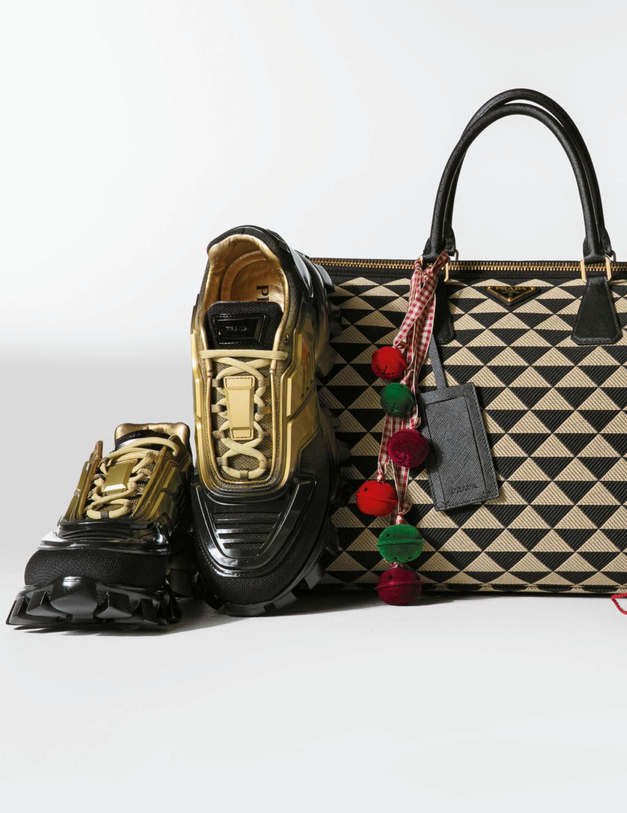 Espacioso y moderno, este nuevo bolso de viaje, en tejido jacquard bordado y detalles de piel Saffiano, reproduce el triángulo que vimos por primera vez en los baúles diseñados por Mario Prada. prada.com