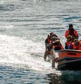 de encontrar. La suerte nos acompaña. La lancha neumática nos regresa a la nave nodriza y unos delfines australes nos acompañan. La jornada transcurre a un ritmo frenético y casi con los postres sin digerir llegamos al glaciar El Brujo. Aquí se desembarca y se camina por las rocas aledañas. Escuchar el ensordecedor estruendo y ver como se desploma parte de la cabecera del glaciar es todo es espectáculo digno de ver, aunque todo el mundo sabe lo significa: deshielo, retroceso y camino a la extinción.