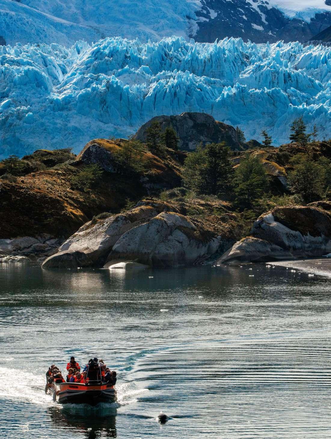 canales no sirve cualquier embarcación. Los Campos de hielo Sur son una enorme masa de hielo milenario de 17,000 kilómetros cuadrados, sobreviviente a la última glaciación ocurrida en la tierra hace más de 20,000 años y que se descuelga hacia las dos vertientes de las cumbres andinas. Argentina ha sabido rentabilizar mejor turísticamente este tesoro de la naturaleza, con el Perito Moreno a la cabeza, aunque sus casi 500,000 visitantes anuales lo están masificando a marchas forzadas. En Chile, en cambio, convergen 42 de las 48 lenguas de hielo, expectantes de que algunos turistas las visiten de vez en cuando. De hecho, estamos hablando de una de las zonas menos estudiadas del planeta. En la actualidad, la mayoría de estos glaciares están en retroceso debido al cambio climático, caracterizado por un aumento de la temperatura y por el descenso de las precipitaciones. Corren el riesgo de desaparecer sino cambiamos ipso facto nuestros hábitos de vida y nos volvemos más sostenibles.