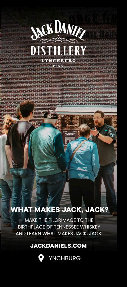 TheAfterJackTraveler’sGuideservesasatargetedretention pieceandisdistributedexclusivelyattheTennesseeWhiskey TrailheadandWelcomeCenter.Designedspecificallyforthe largenumberofvisitorswhoexperienceLynchburgasaday trip,AfterJackhighlightsalternativereturnroutesbacktomajor metromarkets guidingtravelersofftheinterstateandintothe scenicbackroadsandsmalltownsthatdefinetheSouth CentralregionEachrouteincludescommunity-by-community recommendations,encouragingvisitorstoextendtheirtripand exploremorealongtheway