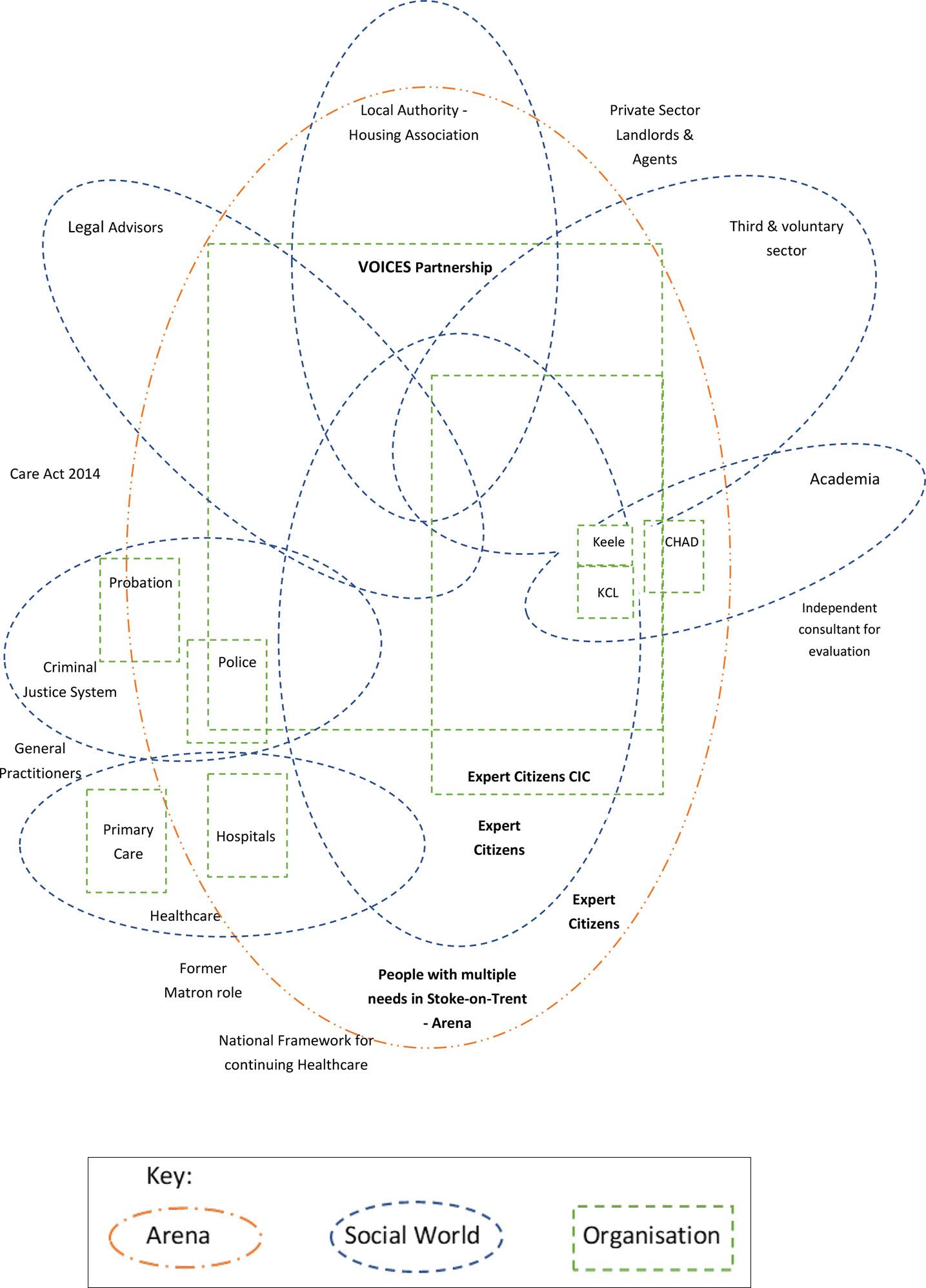 FivedifferentsocialworldscomprisedtheVOICESpartnership:thirdsectorhousing associationsthatsupporthousingneeds;voluntarysectorchampionswhosupportthose whorequireandusehealthcareservices;localpublicsectoragencies,mostlylocal authority(e.g.housingandMaRG)andtheNHS;legaladvisers’socialworld,whichwas dominatedbythethirdsectorwelfareadvisers;ExpertCitizens,whoactedasambassadors oflocalpeoplewithlivedexperienceofmultipleneedsanddisadvantage.