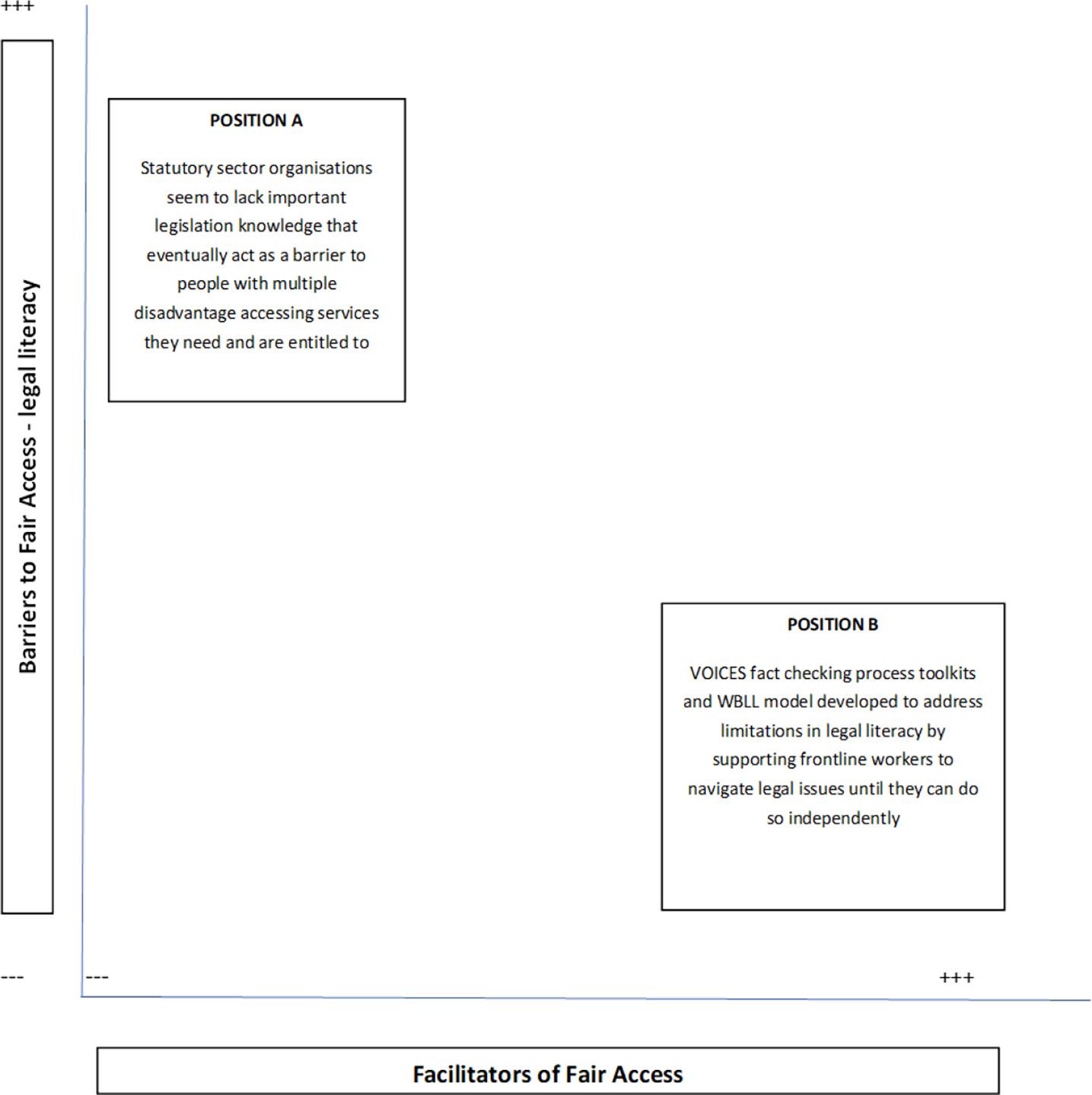 Dataindicatedthatlackoflegalliteracywasacommonfailureofthesystem,whichwas largelyunchallengedbeforeVOICES.Asrepresentedin Figure4,alackofknowledgeof someimportantlegislation(HomelessnessReductionAct 2017; CareAct 2014)inthepublic sector,createsseriousbarriersforpeoplewithmultipledisadvantageinaccessingthe servicestheyneedandtowhichtheyareentitled.Weobservedthepositionthatmanagers andfrontlinestaffworkingwithinsufficientknowledgeormisunderstandingsaround policies,passon“myths”andmisunderstandingstocolleagues,which,inturn,become enactedaspolicy(PositionA).Thisisa‘negativefeedbackloop’,inwhichorganisations lacktheincentivetoaddresstheproblemasdoingsocouldmeanhavingtodealwithmore situationsandpotentiallycomplexcases.