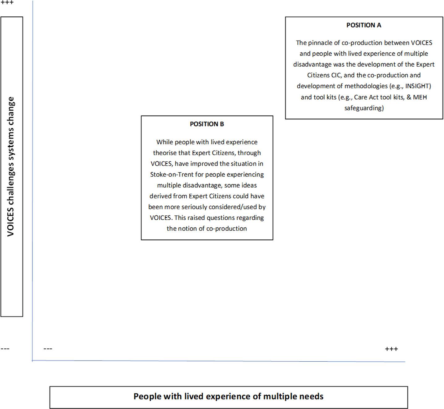 peoplewithlivedexperience(Figure7).Despitethisco-productionandsubstantial contributionExpertCitizens,therewasasuggestionthatnotalltheirideas/suggestionshad beentakenintoseriousconsiderationoractionedbyVOICES(PositionB).