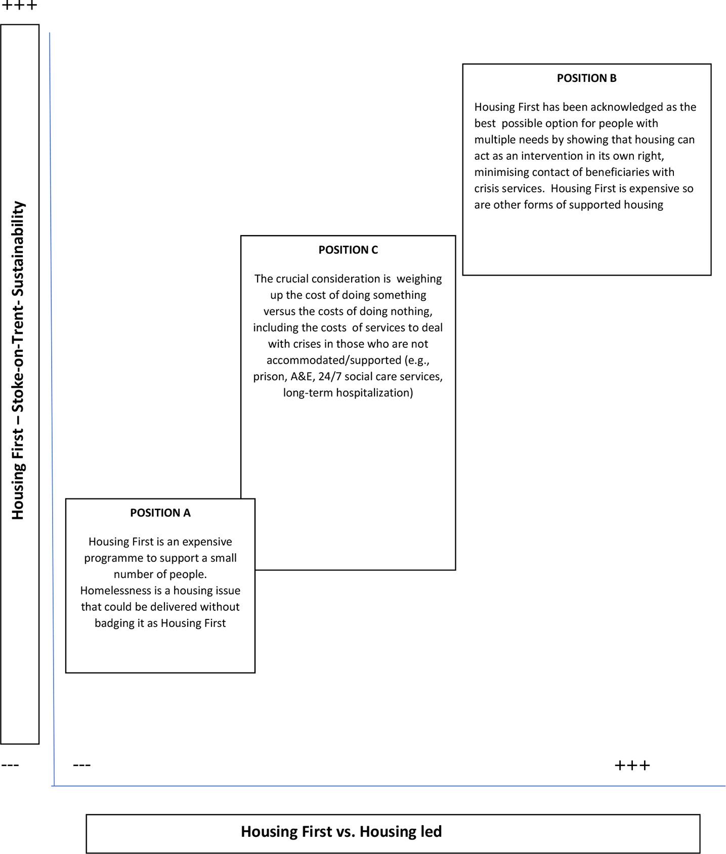 Figure6 illustratespositionsregardingthefutureofHousingFirstasasustainablelocalstrategy totacklechronichomelessness.TheirargumentpresentedHousingFirstasacostlyintervention witharelativelysmallnumberofbeneficiaries,andadvocatedforalessintense,housing-led intervention,whichdeviatesfromHousingFirstprinciples(e.g.finitesupport,tenancyconditional onengagementwithsupportservices;PositionA).Opposingthiswastheperceivedneedto maintainHousingFirstasthekeylocalstrategy,whichwasapparentlyendorsedthroughlocal approvaltoextendtheprogrammefor12monthsusingVOICESfunding(PositionB).Here,the costofHousingFirstwasrecognizedbutwithacounter-argumentthatnumerousothersupport servicesthatareevenmoreexpensive,andwitharelatedargument(PositionC)thatinaction costsmorethandoingsomething,especiallyasaneffectiveinterventionhaswiderbenefits throughavoidingthecostsofdealingwiththeconsequencesofinaction[e.g.incarceration, emergencyhospitalcareand24/7socialcareservices(Gidlow etal.,2021a, 2021b)].