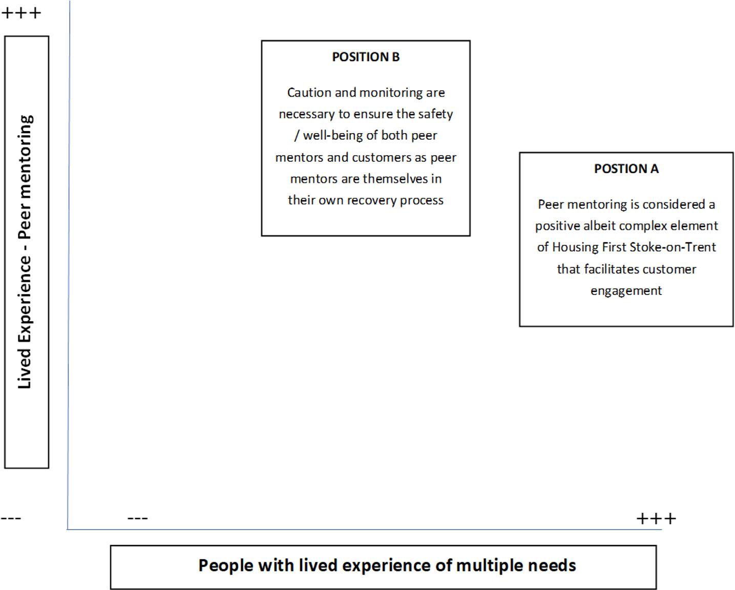 Peermentorswereindividualswithlivedexperienceofmultipleneedsanddisadvantage, whohadjoinedExpertCitizens,receivedtrainingandwerewillingtobeexemplarsto supportcurrentcustomers.TheywereusedprimarilyforHousingFirst.Therewasaposition thatpeersmentoringwasbeneficialforHousingFirstcustomers,helpingtobuildinformal relationshipswithcustomersandsupportwithactivitiesofdailylife,whileacknowledging thecomplexitiesandthatsuchsupportisnotarequirementofHousingFirstprinciples (PositionA).Therewasconcurrentconcernregardingthepotentialnegativeimpactonpeer mentors(PositionB);e.g.peermentorsfeelingobligedtoactbeyondtheremitoftheirrole