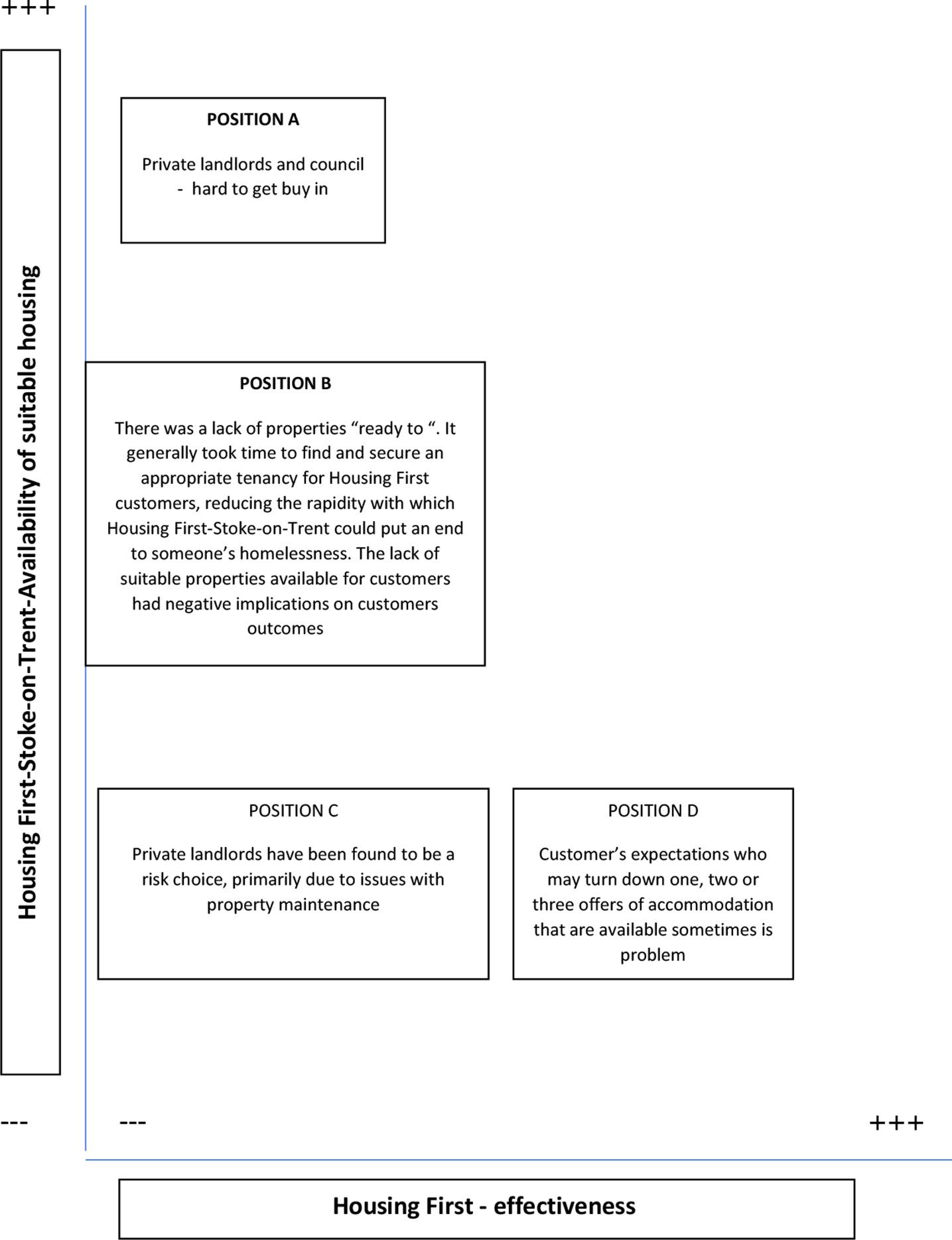 ThemajorissuewithHousingFirstinStoke-on-Trentwasthelimitedavailabilityofsuitable housing.Asshownin Figure5,therewereseveralrelatedpositionsinthedata,twoofwhich appearedtoreflectanissuethatpre-datedtheintroductionofHousingFirst(PositionsA andB)andjeopardiseditsprinciplesandeffectiveness:housingdemandexceeding supply,leadingtodelaysinHousingFirstcustomerssecuringtenancies(PositionB); inconsistentsupplyofsocialandcouncilproperties(PositionA).Thisresultedinareliance onprivatelandlordsandlettingagents,whichhadcreatedsomeissuesaround accommodationqualityandmaintenance(PositionC).