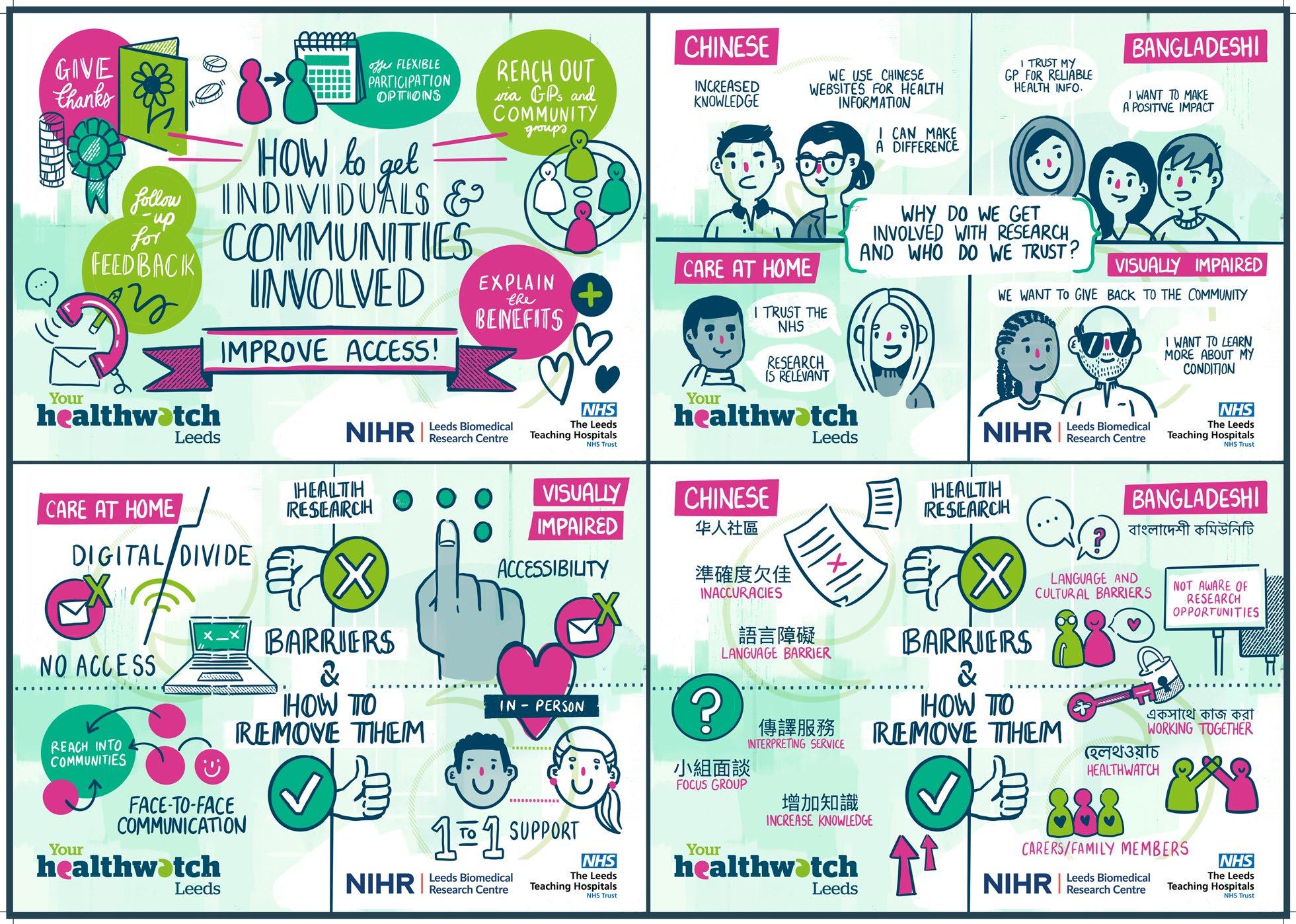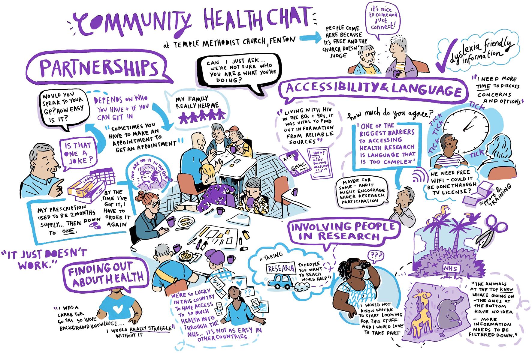 Key fndings from the community conversations were captured through illustrations (visual notes, artwork, and posters) and written notes. Te visual notes and artwork for the Expert Citizens, VAST, and Leeds Involving People community conversations were created during the events by live illustrators, one of whom was a Leeds Involving People member (Table 2). Tis helped to support the conversations, prompt further discussions, and ensure the visual notes and artwork closely refected the discussions. It also aided the relationship building and helped to address power imbalances. Given the Healthwatch Leeds community conversations were held as eight discussions, having a live illustrator present was not possible so posters were created to bring all the fndings together after the conversations. Te development of the posters was led by Healthwatch Leeds and undertaken by a creative design company.