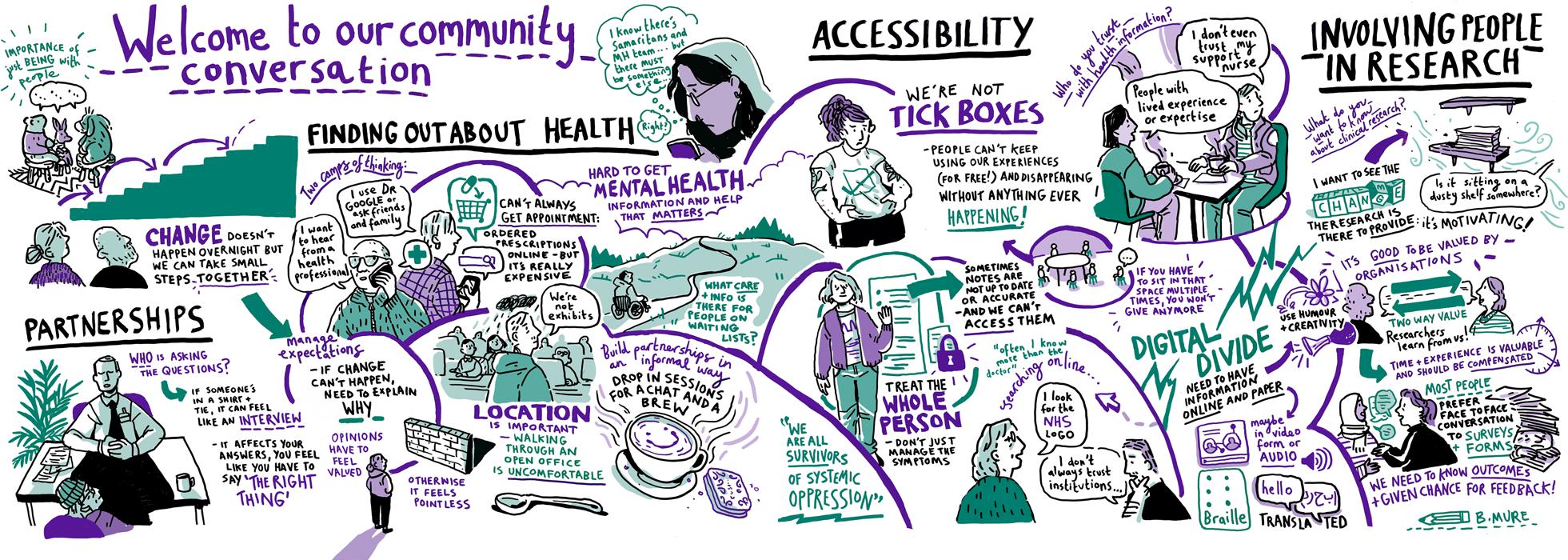 Written notes of each community conversation were made by members of the community organisation teams and/or university teams who attended the conversation and then shared with the wider project team. Formal qualitative analysis of the illustrations and written notes was not undertaken because this was a public involvement project. Te initial intention was to include a separate summary of each community conversation in the academic paper. However, when refecting on the initial summaries, the authorship team noticed that key messages were repeated across the conversations, so decided that grouping the fndings of all the conversations together would be more appropriate.
