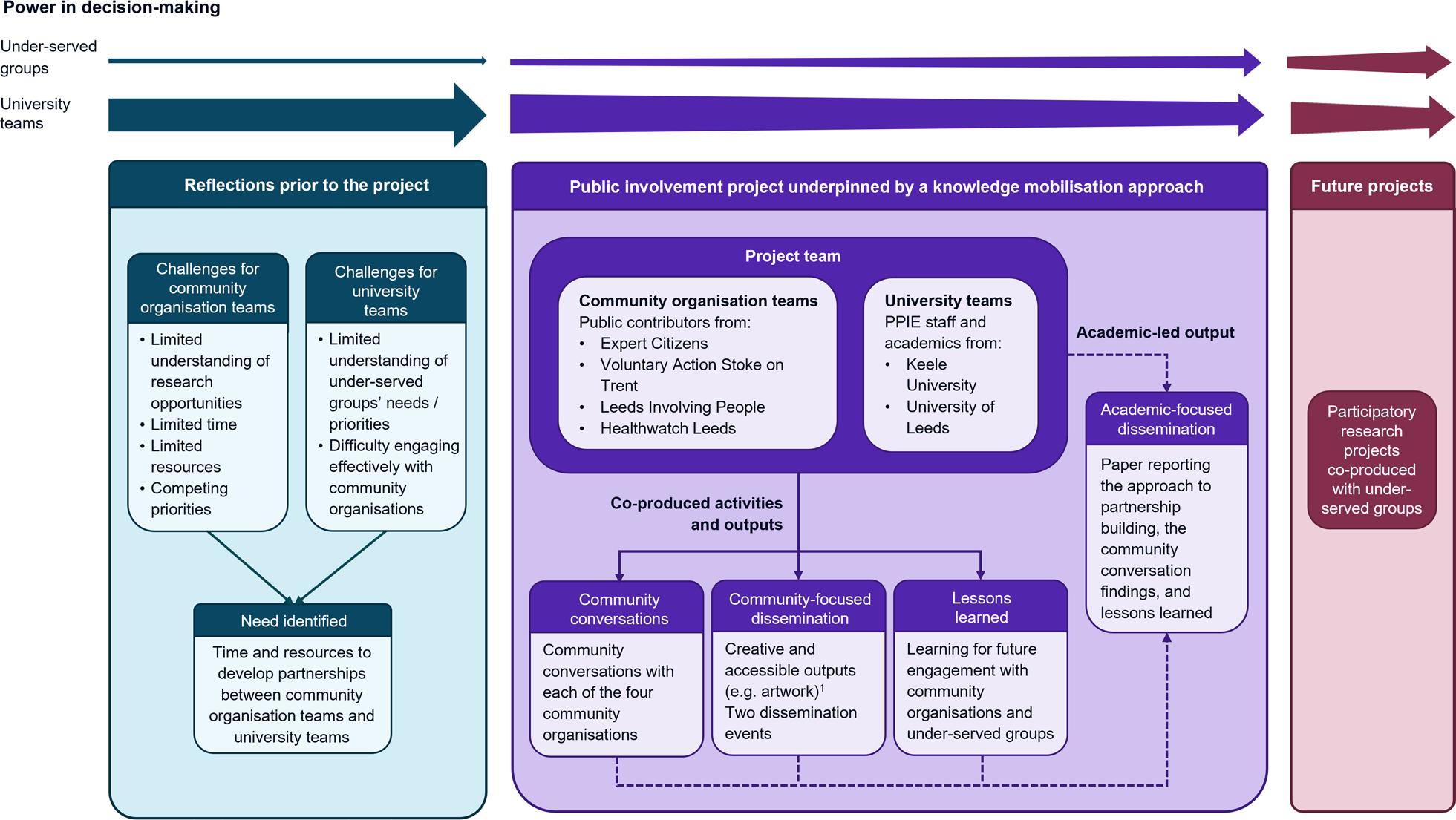 Te project team aimed to approach this project with the recognition of their positions of privilege and oppression, an awareness of the importance of considering intersectionality, and the intention to shift power from university teams to under-served groups. Te project team acknowledge that university teams currently hold more power than under-served groups in this context and, while this project represents an important initial step in addressing this, further work will be required to continue addressing the power imbalances (Fig. 2, Additional File 1). A range of practical steps were taken in this project to help address power imbalances. Tese included allocating 70% of the total project budget to the community organisations, not using academic titles, holding the community conversations in locations chosen by the public contributors, and ensuring the numbers of public contributors present at the community conversations were greater than the number of university team members present.