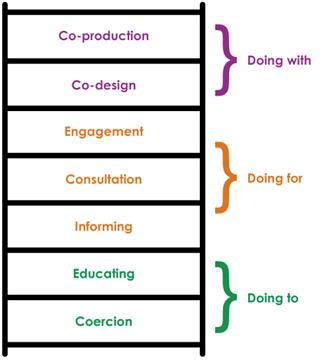 A common visual for co-production is the co-production ladder. However this was felt too restrictive for many involved and also encouraged a negative attitude towards the ‘lower rungs’ on the ladder (see image to side).