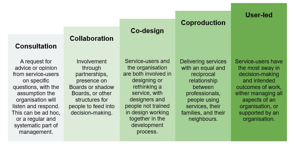 Most people will describe co-production as a journey. Often this journey starts with listening, then involvement, then moves further towards embedded co-production.