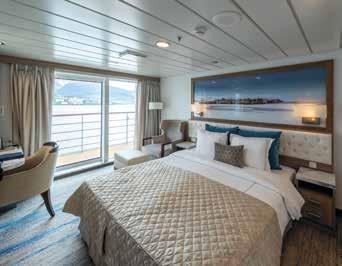 A modern ship, the Magellan Explorer started service in the 2019 Antarctic season. It cleverly minimises its fuel consumption by recycling the heat produced by the engines to power the heating and hot water! Each cabin (there’s room for 76 guests) has its own individually-controlled heating as well as heated floors in private bathrooms. In the communal areas, there’s state-of-the-art audio-visual equipment for onboard learning, as well as a glassenclosed observation lounge and a forward-facing observation deck leading to the ship’s bow, so you’re as close as possible to the action when you’re wildlife watching. There’s a fitness centre, too.