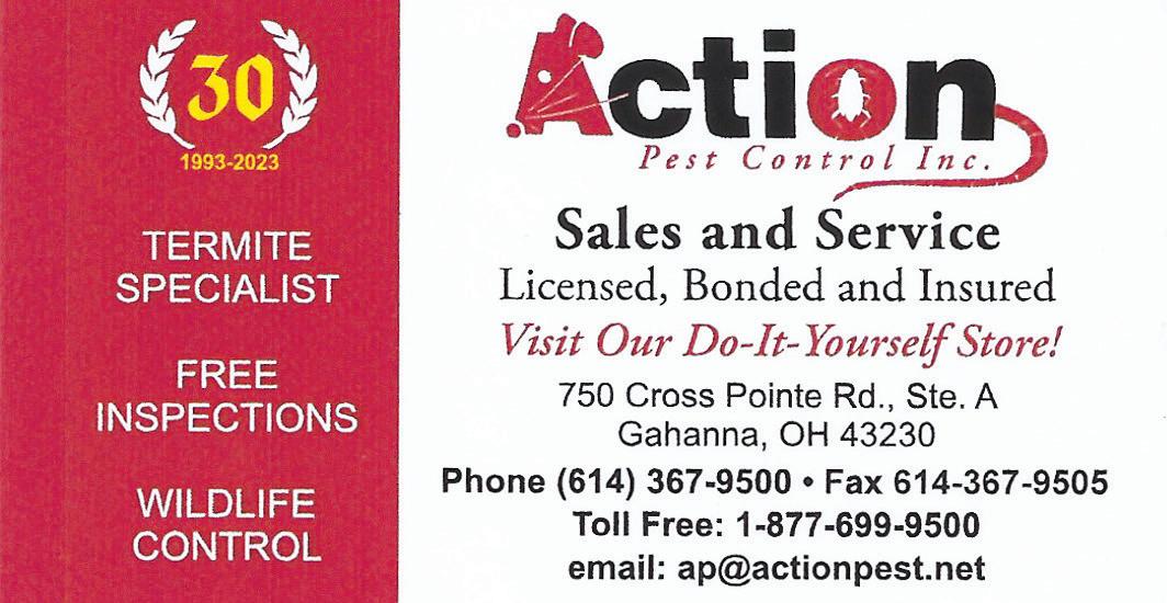 Action Pest Control Inc., located Gahanna, OH. Full time, Mon.-Fri. $ 14 00 to start. Call today! Start today! 1-877-699-9500
