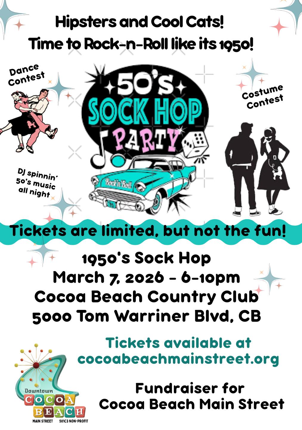 March is especially busy, with events starting March 7th: The 50’s Sock Hop. It is a fundraiser for Cocoa Beach Main Street. Girls, get out your pedal pushers and poodle skirts, and guys, slick back your hair and grab that leather jacket. We are going to be dancing and jivin’ the night away. Tickets are available online now. We need people to party, buy a