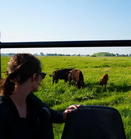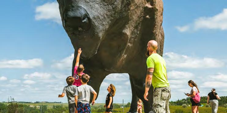 Startwithaselfie attheWorld’sLargest Buffalo.This26-foottall concrete monument has greeted travelers since 1959 and stilldrawssmilestoday.Nearby,theNorthAmericanBison DiscoveryCenterbringsyoufacetofacewithlivebisonand shares the story of these animals and their place on the prairie.