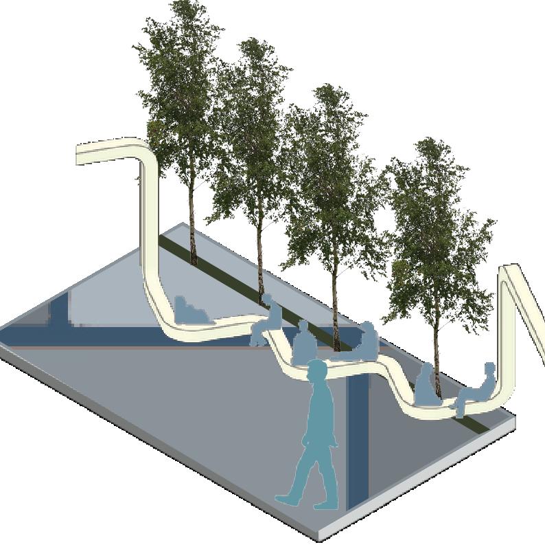 Annonce du parcours: le changement du pavé au sol annonce le début de l’esxpérience. Ceci a pour but d’adoucir de plus le flux véhiculaire et relier visuellement les élèments majeurs du tronçon.