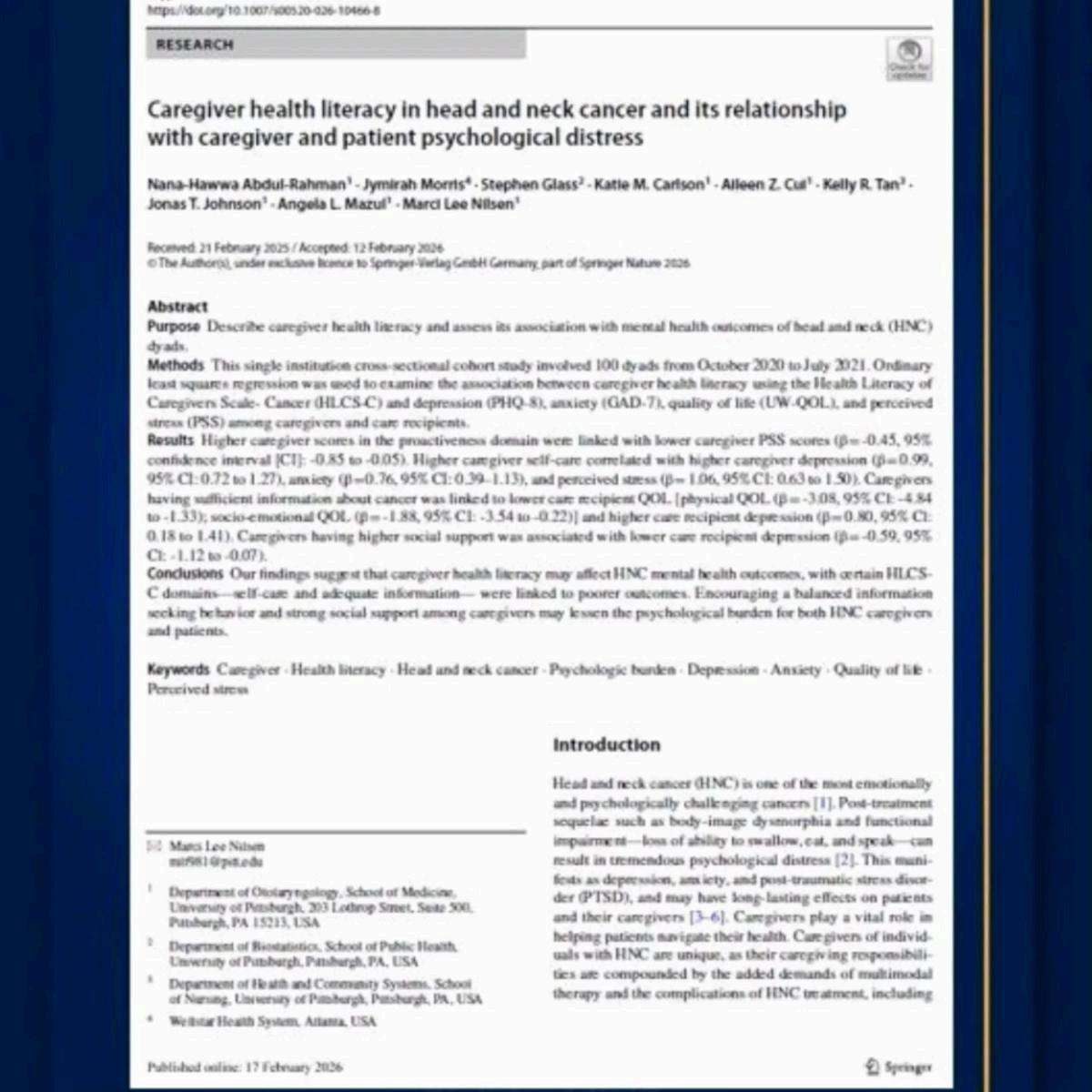 Surgery is excited to share its latest study exploring how caregiver health literacy impacts the mental health and well‑being of head and neck cancer (HNC) caregiver–patient pairs. In a cohort of 100 HNC dyads (2020–2021), we examined how caregivers’ health literacy—measured with the Health Literacy of Caregivers Scale–Cancer (HLCS‑C)—relates to levels of depression, anxiety, perceived stress, and quality of life for both caregivers and patients. Our findings shed light on the role caregivers play in cancer care and on how supporting their understanding of health information may improve psychological outcomes for both the caregiver and the patient.