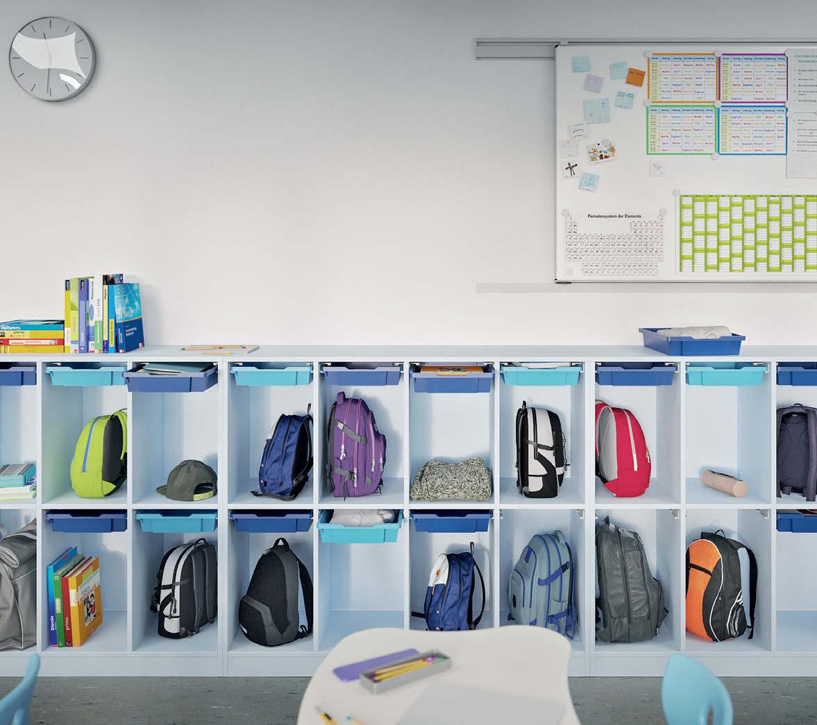 Exceptional tidiness in the cloakroom area. The Serie 800 satchel cabinet provides great clarity and tidiness. Each compartment has an integrated pull-out element for a plastic box.