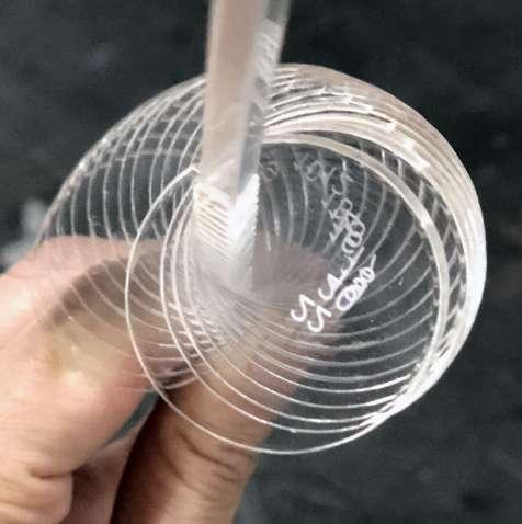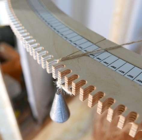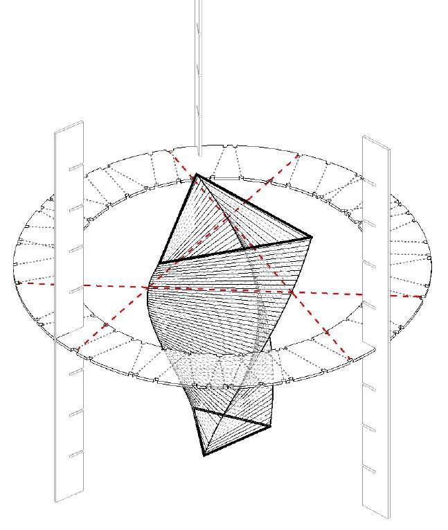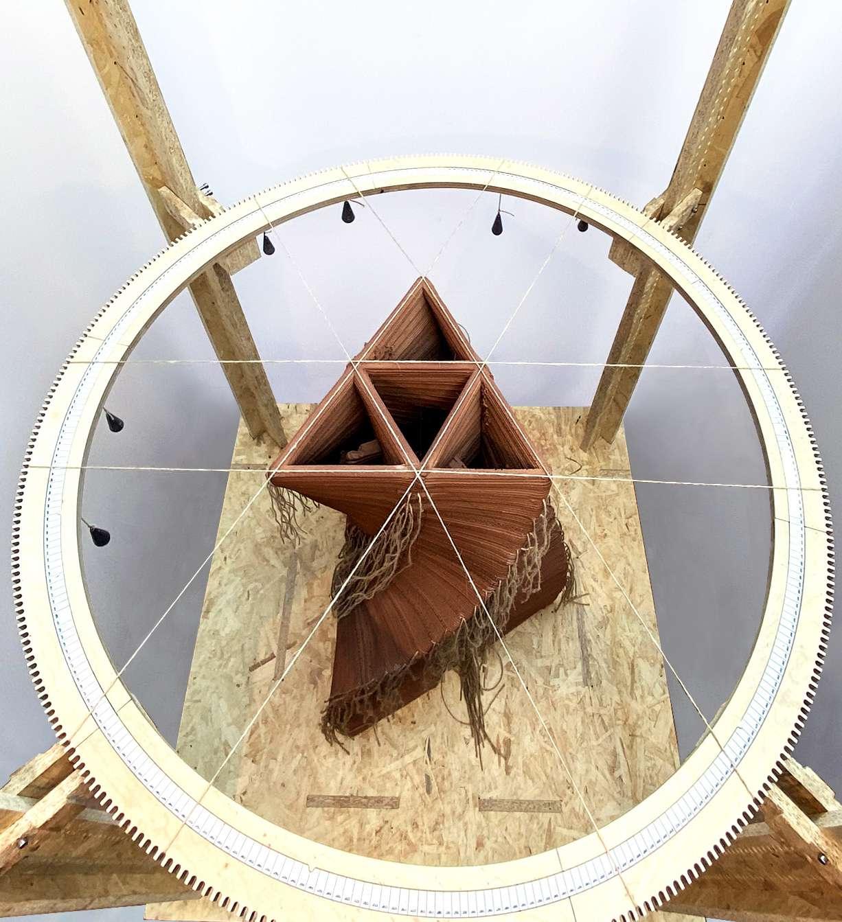 After considering 3 different designs (different geometry, rotation angle), C1 was chosen because it has 45-degree overhang. The prototype wheel has engraved notches by later cutting. These notches are extensions of the object’s contour lines (30mm distance). Engraved notches hold ropes, and metal clips hanging on ropes keep tension of ropes.
