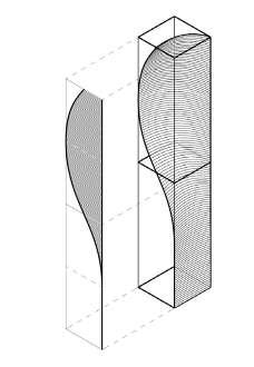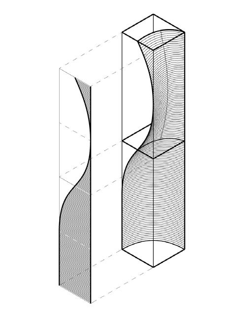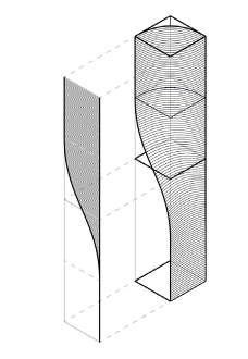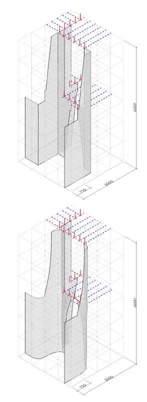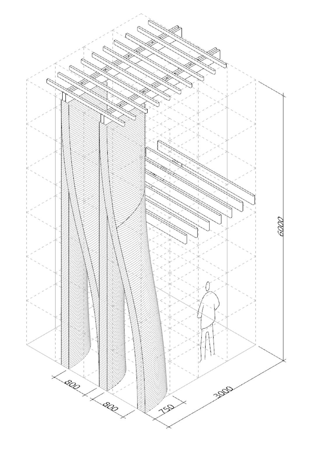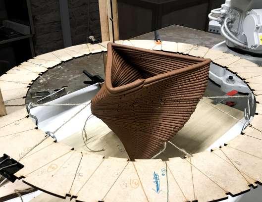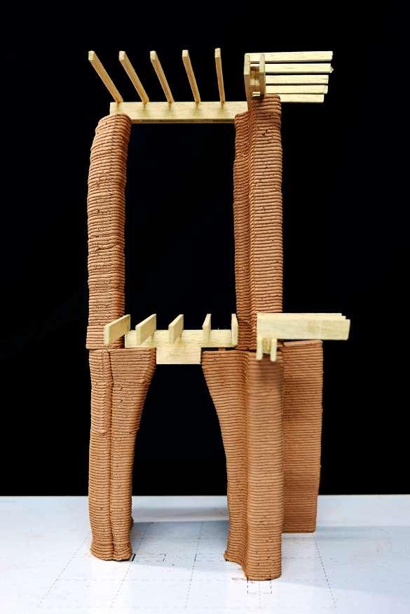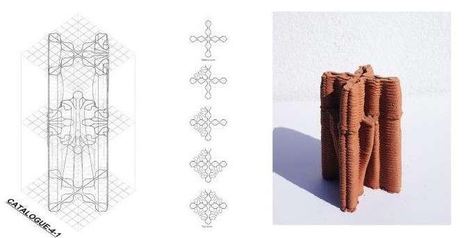 Two different concept designs are selected for the test in Iaac. First one is to make supports for placing wooden beams. Those supports are generated from diverged curves of the column.This design can have 4 supports on different heights. Second one is for making openings in the column. The printing path of the column is connected in the bottom part but the surface of column is diverged to two parts in the middle and it is converged to one on the top again. By controlling the converging and diverging, the size, location and number of openings can be controlled. The 1:10 scale tests are done in a small delta clay printer and both of those designs are successful to be printed in that scale. 1:5 scale printing test is completed by the robotics arm. During printing, unstable parts are found and the design is modified for stable printing in large scale.